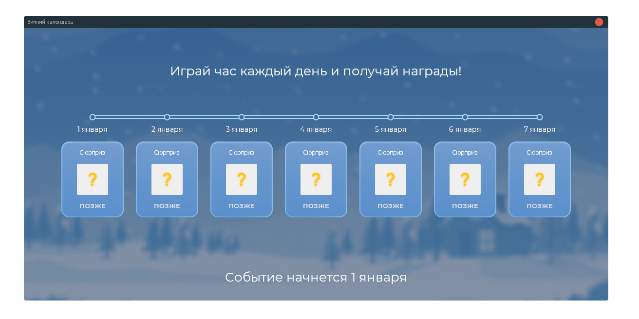 В честь Нового года мы запускаем специальное праздничное событие. Уже с 1 января вас ждут ежедневные награды, достаточно просто проводить на сервере 1 час в день, чтобы получить свой новогодний бонус.