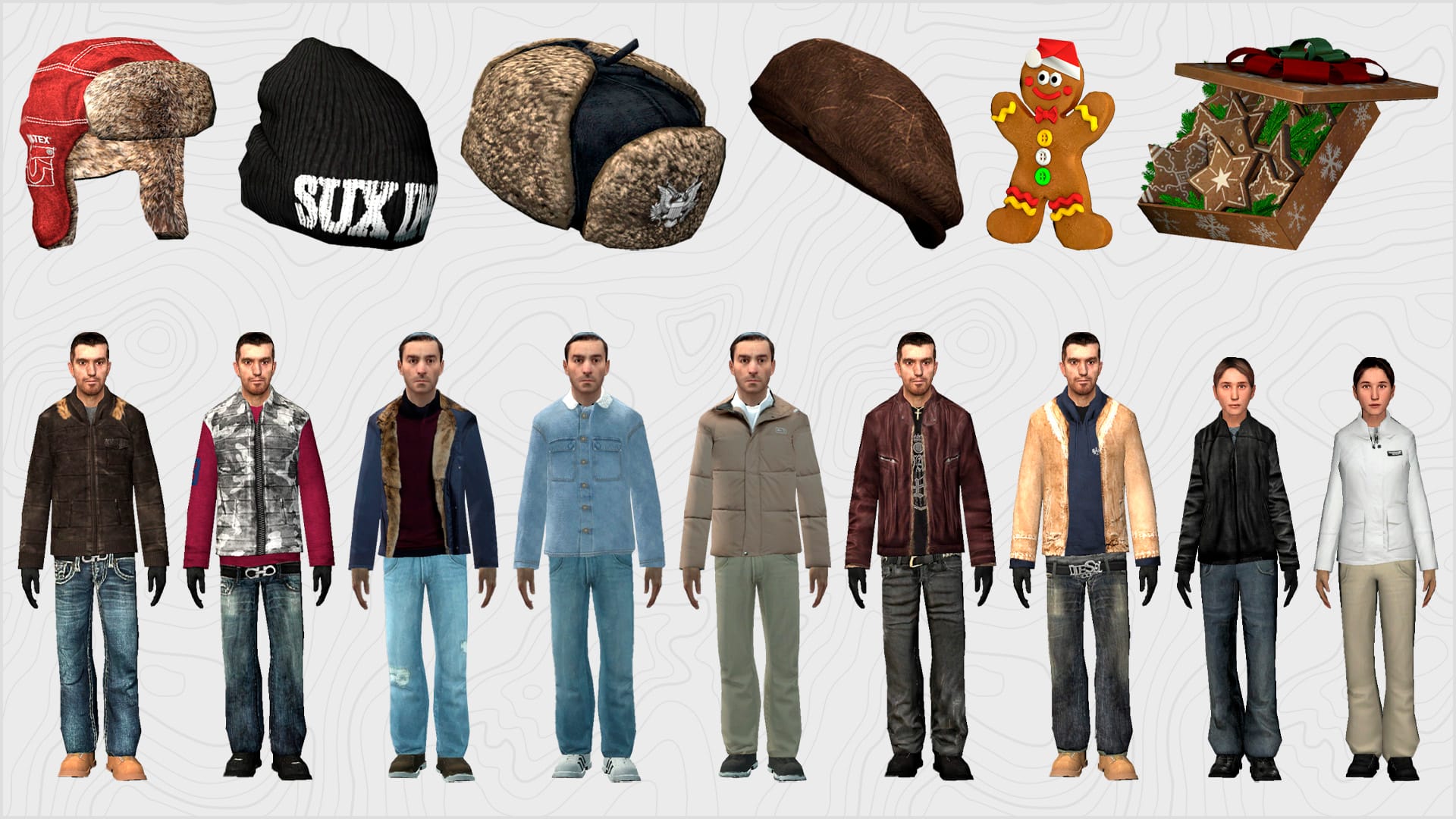 - 9 уникальных наборов одежды (включая 2 женских) - некоторая одежда перекочевала сюда из старой коробки со случайным костюмом